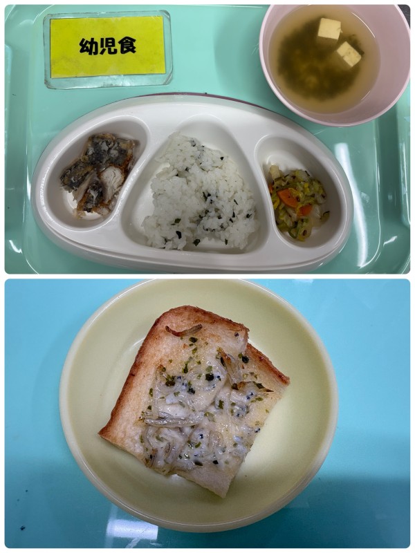 わかめご飯、魚の竜田揚げ、白菜の昆布和え、豆腐すまし汁 15時のおやつ じゃこトースト