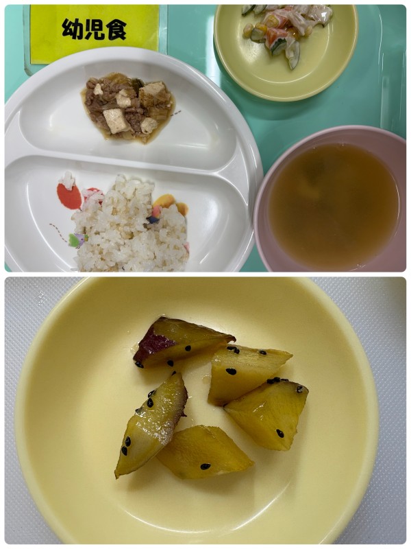 ご飯、肉豆腐、れんこんのサラダ、みそ汁 15時のおやつ 大学芋