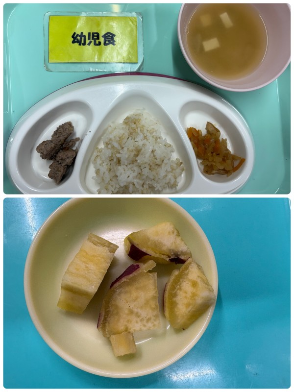 ご飯、なすハンバーグ、切り干し大根の旨煮、豆腐みそ汁 15時のおやつ 蒸し芋🍠