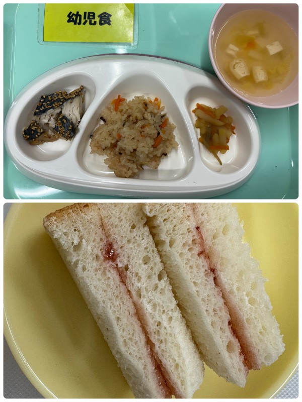 しいたけごはん、さわらのごま照り焼き、じゃがいもきんぴら、みそ汁 15時のおやつ ジャムサンド