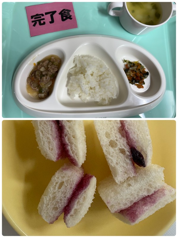 ご飯、八宝菜、もやしとわかめのナムル、中華スープ 15時のおやつ ブルーベリージャムサンド