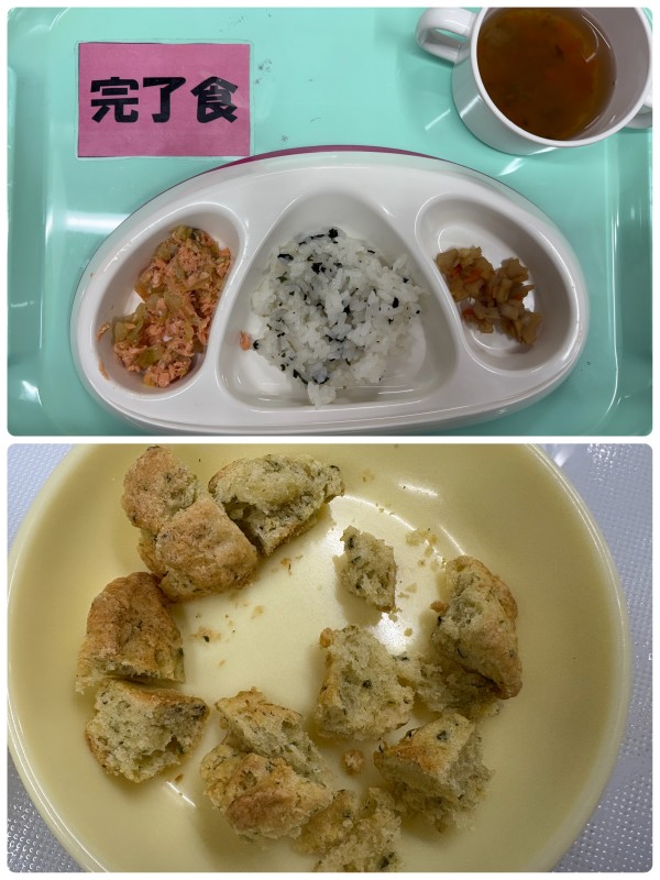 わかめご飯、鮭のちゃんちゃん焼き、きんぴられんこん、すまし汁 15時のおやつ 小松菜バナナスコーン