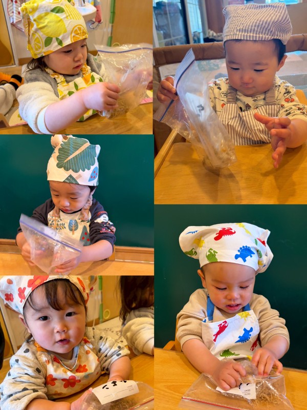 今日はクッキングでふりかけ作りをしました。かつおとおじゃことごまをジプロックに入れて、シャカシャカしました✨みんな興味津々で一生懸命シャカシャカしてくれている姿がとっても可愛かったひよこ組さんでした🐣💖その後、給食のご飯の上に乗せて美味しくいただきました😋🍴写真2枚目ありです‼︎