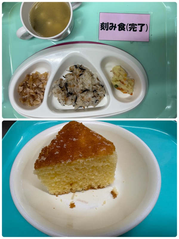 さけとひじきの混ぜごはん、鶏のから揚げ、ポテトサラダ、豆腐みそ汁 15時のおやつ レモンケーキ🍋
