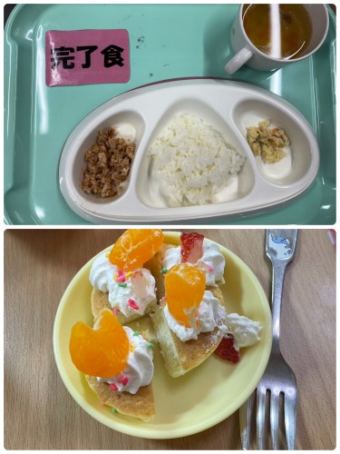 クッキング🎅🏻🎂✨ 2025/12/25(木) 今日はクリスマスパンケーキのクッキングをしました🎄!先生がしぼる生クリームをじーっと見たり先生と一緒に生クリームをしぼったりとそれぞれ楽しんでクッキングしてくれました🎅🏻🎶パンケーキにフルーツをトッピ...