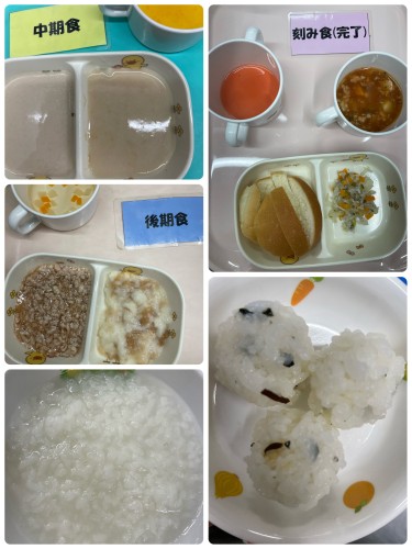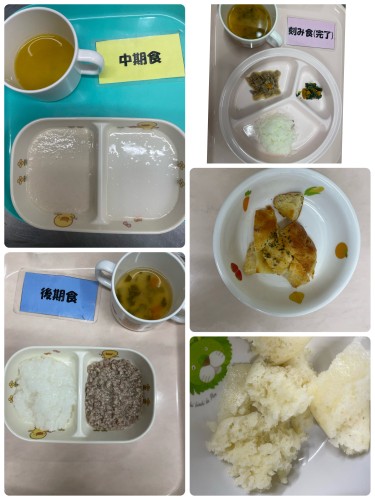 本日の給食 2023/08/28(月) 中期 7倍粥、鶏そぼろ煮、みそ汁 後期 5倍粥、鶏そぼろ煮、みそ汁 完了期 御飯、筑前煮、ブロッコリーのマヨ和え、みそ汁 15時のおやつ ハイハイン、鶏レバーの甘辛煮