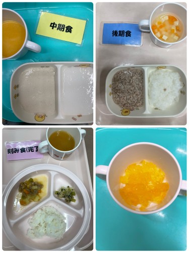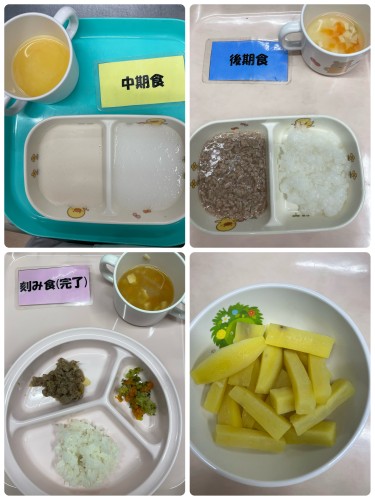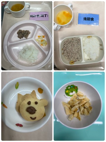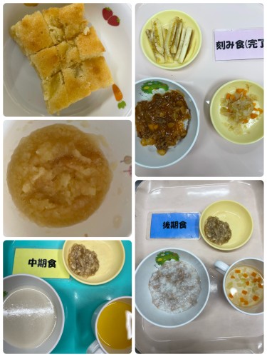 本日の給食 2023/08/07(月) 中期 鶏そぼろおじや、スープ、バナナ 後期 豚そぼろおじや、スープ、バナナ 完了期 ハヤシライス、キャベツのおかか和え、バナナ 15時のおやつ リンゴ、ホットアップル・ケーキ