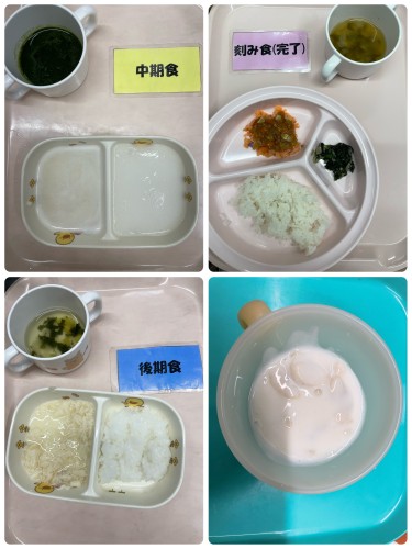 本日の給食 2023/08/29(火) 中期 7倍粥、鶏そぼろ煮、スープ 後期 5倍粥、豚そぼろ煮、スープ 完了期 御飯、なすと豚そぼろの味噌炒め、チンゲンサイのしらす和え、中華スープ 15時のおやつ スティックにんじん きな粉麩のラスク