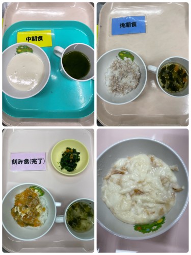 本日の給食 2023/08/21(月) 中期 7倍粥、白身魚の煮付け、みそ汁 後期 5倍粥、白身魚の煮付け、みそ汁 完了期御飯、鮭の野菜あんかけ、ほうれん草のお浸し、みそ汁 15時のおやつ フルーツヨーグルト