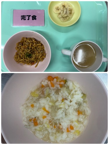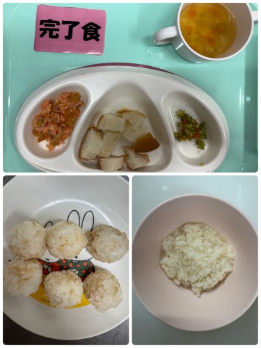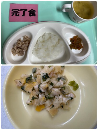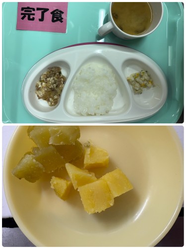 本日の給食 2025/11/06(木) 後期 5倍粥、白身魚の煮付け、みそ汁 15時のおやつ 蒸しさつまいも 完了食 軟飯、鮭と切り干し大根のあんかけ、ポテトサラダ、みそ汁 15時のおやつ スイートポテト🍠