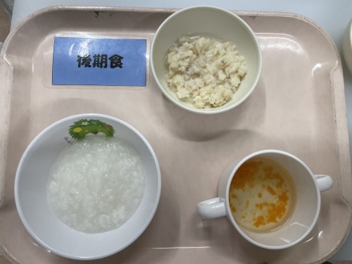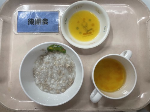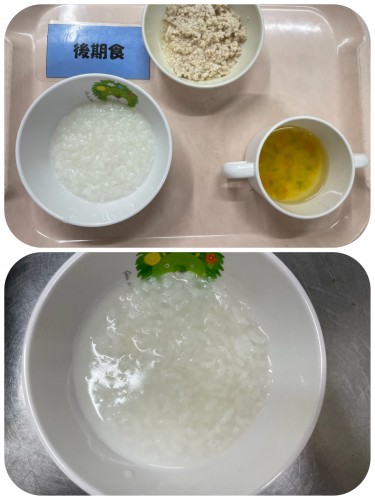 中期 7倍粥、鶏そぼろ煮、すまし汁 後期 5倍粥、豚そぼろ煮、すまし汁 15時のおやつ ハイハイン