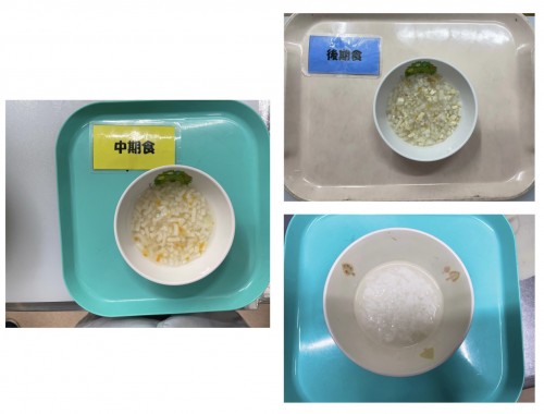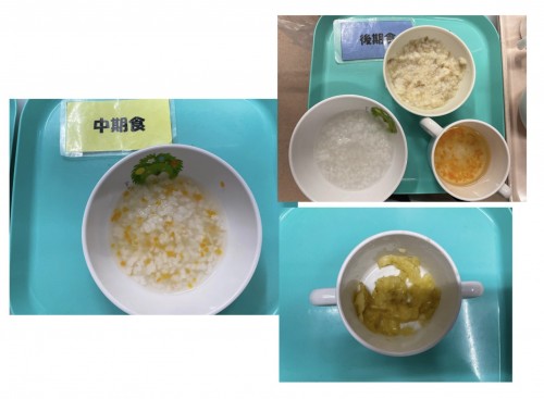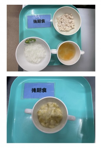 中期 おかゆ(キャベツ、にんじん、だいこん) 後期 7倍粥、豚そぼろ煮、豆腐のみそ汁 15時のおやつ バナナ