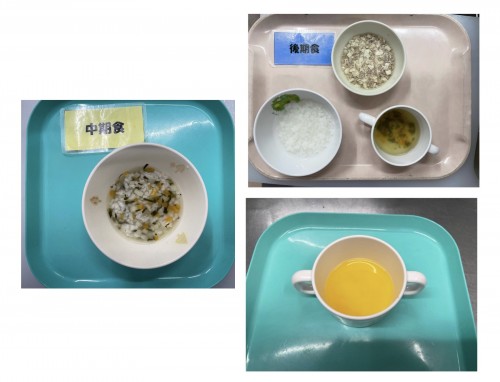 中期 おかゆ(にんじん、たまねぎ、ほうれん草) 後期 鶏ひき肉のおじや、みそ汁 15時のおやつ ハイハイン