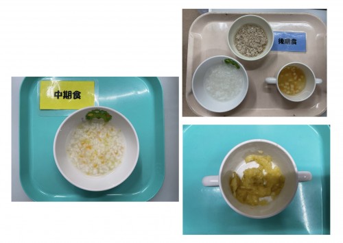 中期 おかゆ(にんじん、じゃがいも) 後期 7倍粥、豚そぼろ煮、すまし汁 15時のおやつ 7倍粥