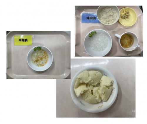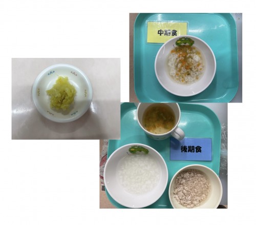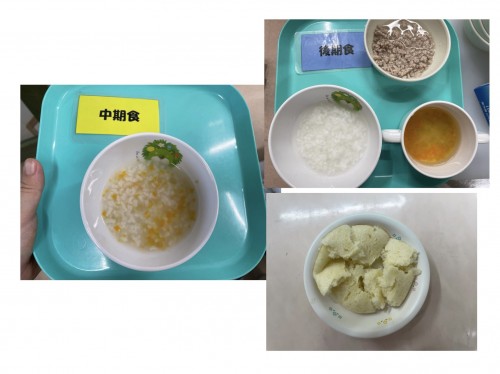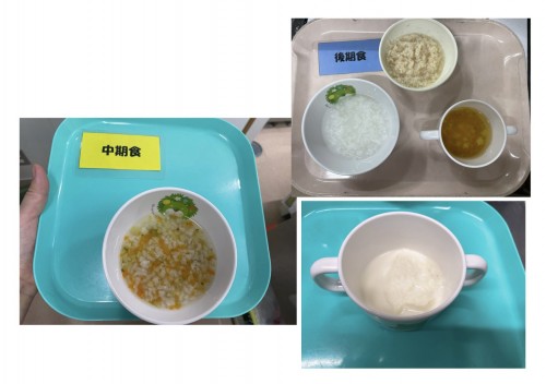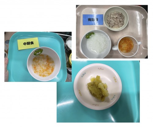 中期 おかゆ(にんじん、たまねぎ、じゃがいも) 後期 7倍粥、豚そぼろ煮、スープ 15時のおやつ 蒸し芋