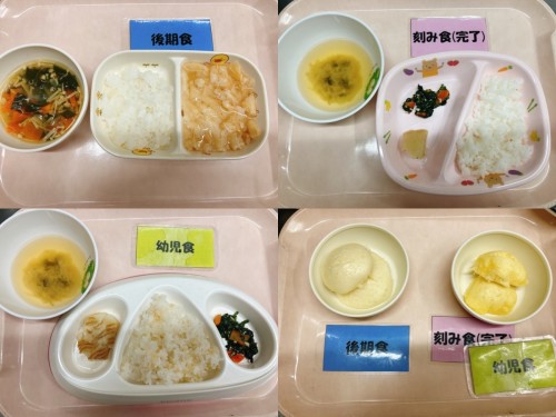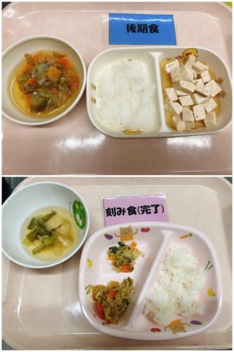 本日の給食 2021/11/30(火) 後期食軟飯 高野豆腐の煮物 野菜スープ🥬刻み食 幼児食ごはん 豚肉の味噌炒め ひじきとさつまいもの煮物🍠 すまし汁おやつ後期食かぼちゃ蒸しパン🎃刻み食 幼児食スイートパンプキン🎃
