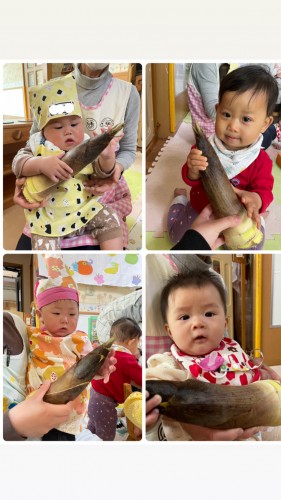 大きい大根🥬 2021/02/17(水) 朝に大きな大根を見ました🥬大きな葉っぱに驚き少し怖がるひよこ組さんそーーっと触ってみると、こんこんと言ったり抱っこして重たそうな顔をしたりととても楽しそうでした😊公園では冷たい風が吹くなか、元気いっ...