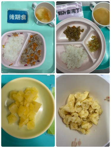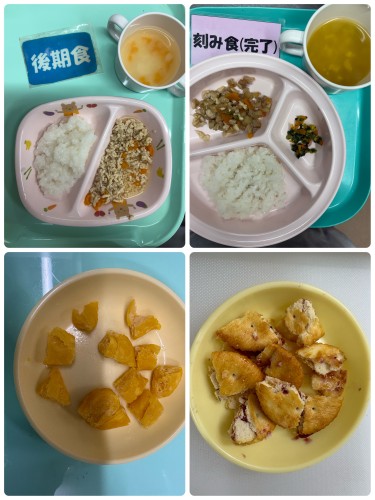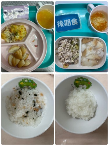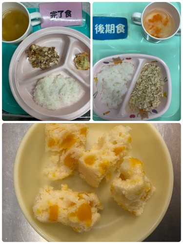 本日の給食 2025/09/12(金) 後期 5倍粥、豚と野菜のそぼろ煮、みそ汁 15時のおやつ 蒸し芋 完了食 軟飯、豚と野菜のカレー炒め、キャベツのしらす和え、みそ汁 15時のおやつ スイートポテト