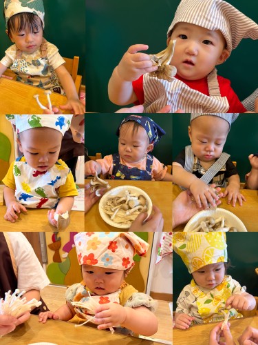 クッキング 2025/09/17(水) 今日はクッキングできのこさきをしました〜🍄色々な種類のキノコに興味を持って自分から手で掴もうとする姿や指でツンツンしてニコッと笑っている姿を見せてくれたひよこ組の子達でした🐣✨みんな楽しそうに取り組む...