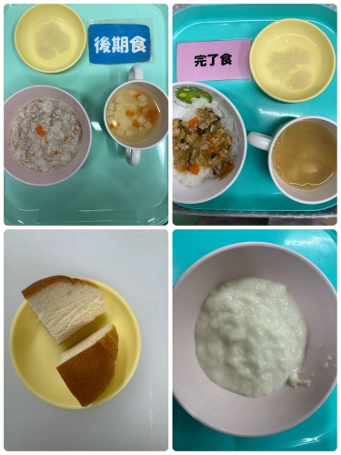 本日の給食 2025/09/08(月) 後期 5倍粥、鶏と野菜の煮物、みそ汁 15時のおやつ かぼちゃのおやき 完了食 軟飯、鶏とれんこんの煮物、小松菜とコーンの和え物、みそ汁 15時のおやつ クラッカーサンド