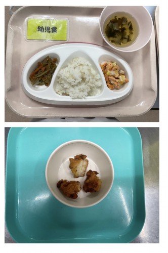 御飯、鮭のコーンフライ、ほうれん草のツナあえ(キャベツ)、豆腐のすまし汁(なす、ねぎ) 15時のおやつ フライドポテト