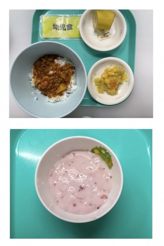 ハヤシライス、キャベツのコーン煮、バナナ 15時のおやつ フルーチェ