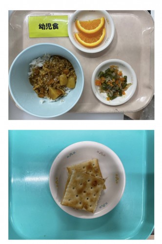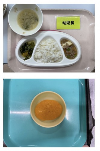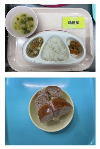 御飯、豚肉や香味焼き(もやし)、ポテトサラダ(りんご)、すまし汁(たまねぎ、わかめ) 15時のおやつ ケチャップライスおにぎり