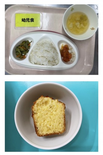 御飯、たらのケチャップあんかけ、きゅうりの昆布和え、スープ(キャベツ、コーン) 15時のおやつ パウンドケーキ
