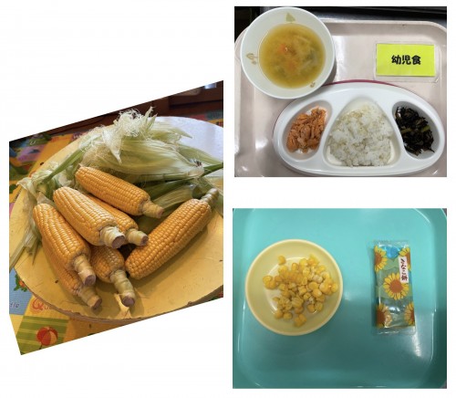 御飯、鮭の香り焼き、ひじきの煮物、みそ汁 15時のおやつ ゆでとうもろこし、せんべい子どもたちがむいてくれたとうもろこしをおやつで出しました🌽