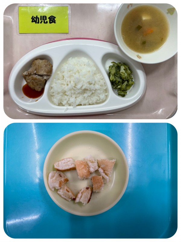 御飯、ハンバーグ、温野菜、豆腐みそ汁 15時のおやつ 蒸しパン(焼き)