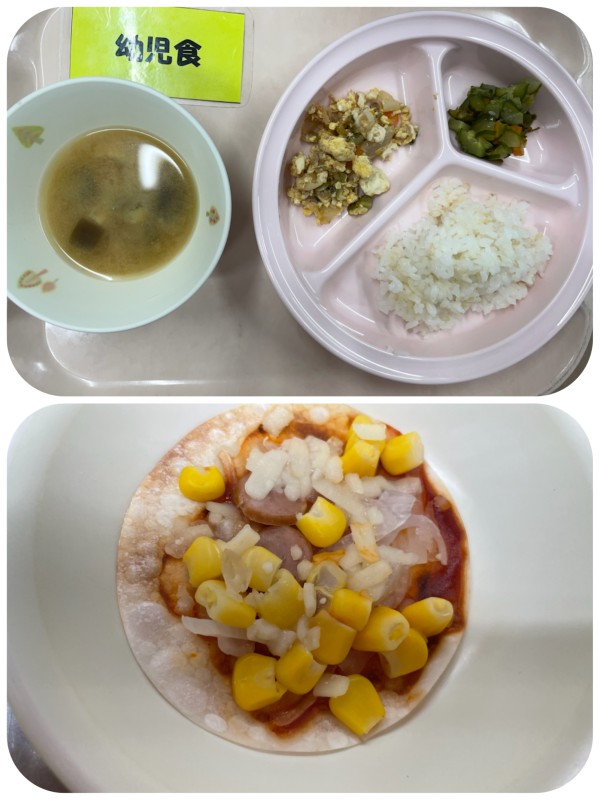 御飯、ゴーヤチャンプル、きゅうりとにんじんの昆布和え、みそ汁 15時のおやつ 簡単ピザ