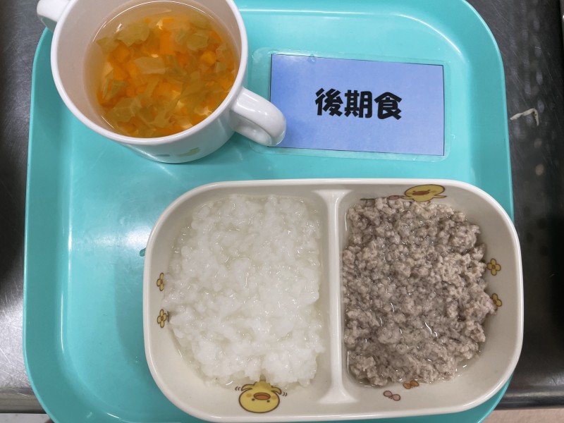 5倍粥、豚そぼろ煮、スープ 15時のおやつ ハイハイン