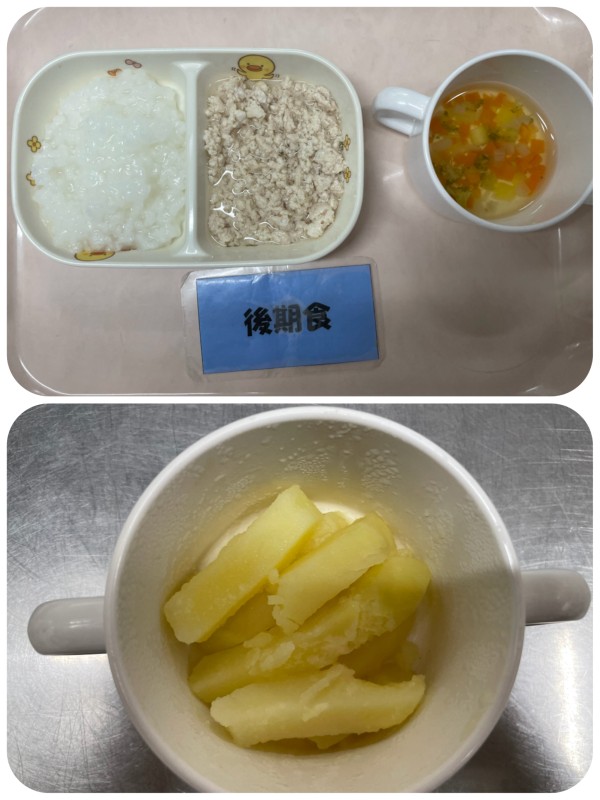 5倍粥、鶏のそぼろ煮、スープ 15時のおやつ ポテト