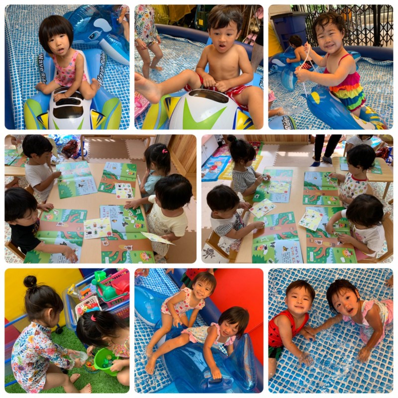 今日も天気がとてもよかったので、大きなプールで遊びました!自分でプールバックを持ってき、水着を出し、服を脱いで、一人で水着を着れるようになってきたリス組さん。自分で着ることができると保育者に嬉しそうに見せてくれていました。また、脱いだ服も自分でたたみ、バックに入れてくれています!その後、みんなの大好きな「かえるの体操」をし、プールに入りました。シャチの形をした浮き輪にお友達と2人で乗ったり、スーパーボールをバケツに入れて混ぜたり、ワニさん歩きでプールの中をグルグル回ったりし、とても楽しそうに遊んでいました!また、前までは水に顔をつけるのを怖がっていたのですが、今日は自ら水に顔をつけ「せんせい、顔つけれたよ」と大喜びし、教えてくれ「もう一回するから見といて」と言い保育者に見せてくれていました♪日々、成長する子どもたちの姿を見ることができとても嬉しいです!プールの後、みんなでワンダー絵本のシール貼りをしました。色んな虫を貼ったのですが、「この虫は、どこにすんでるんかな?」などと、考えながら貼ったりする姿が見られ、とても可愛かったです。今日も楽しく過ごしたリス組さんでした!