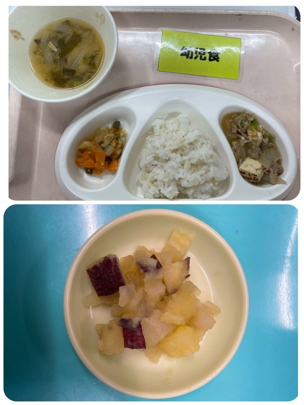 御飯、肉豆腐、いんげんのごまあえ、みそ汁 15時のおやつ アップルポテト