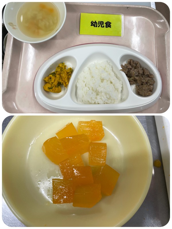 御飯、豚肉の香味焼き、かぼちゃサラダ、みそ汁 15時のおやつ キャロットゼリー