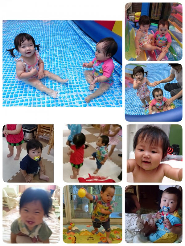 プールに入る前に「かえるのたいそう」をしています。りす組さんの真似をして足を上げたり、手を振るようになりました。プールも楽しめるようになり、「まだ出たくない❗」と言うほど楽しんでいます。遊び疲れて給食を終えるとすぐに眠る子、お友達や先生とゆったりした時間を過ごしてから眠る子といます。お盆休みに入ります。ケガなどないようにお過ごしください。
