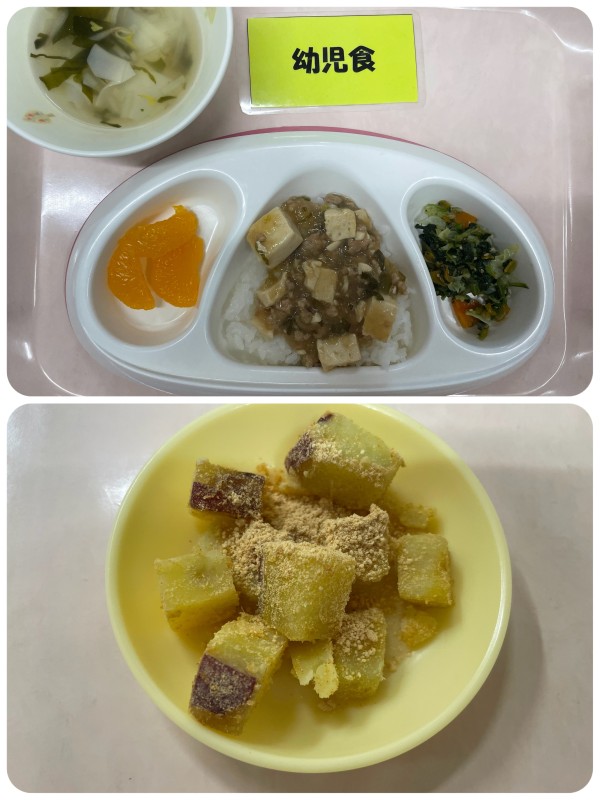 マーボー豆腐丼、ほうれん草のナムル、ワンタンスープ、みかん缶 15時のおやつ きな粉ポテト