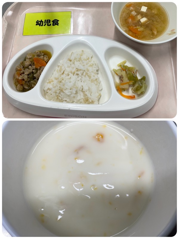 御飯、豚肉と野菜のカレー炒め、きゃべつとしらすのサラダ、みそ汁 15時のおやつ みかんヨーグルト