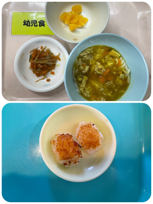 カレーうどん、きんぴらごぼう、オレンジ 15時のおやつ 五平餅