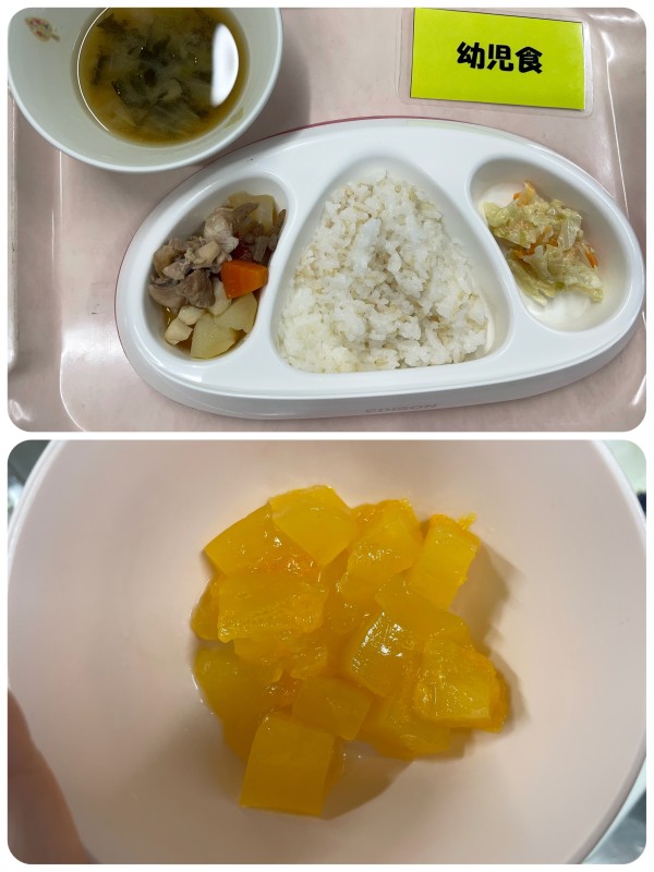 御飯、おでん風煮物、キャベツのごまマヨ和え、みそ汁 15時のおやつ オレンジゼリー