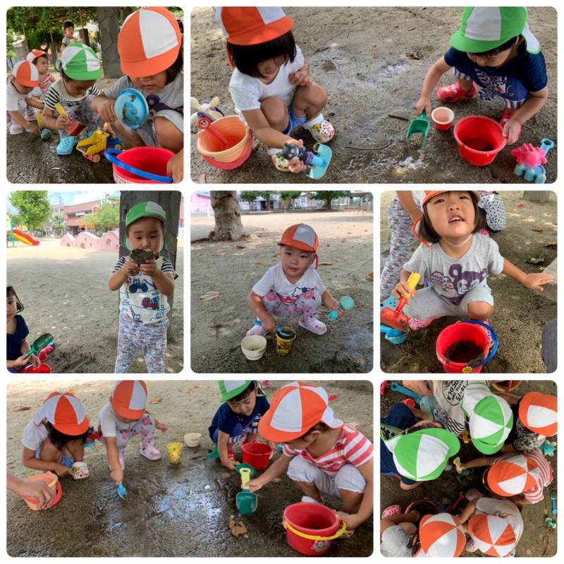 今日は、前半に泥んこ遊びをしました!久しぶりの泥んこ遊びにリス組さんは、大喜び♪お友達と一緒にバケツに泥んこを入れ、かき混ぜたり、その中に手を入れ「キャー。冷たい」「みてみて、手ドロドロなった〜」と言い感触を楽しみ遊んでいました!また、「せんせい、おいしいもの作ってるねん」と泥んこを料理に見立てとても楽しんで遊んでいました。笑顔溢れる泥んこ遊びになりました♪