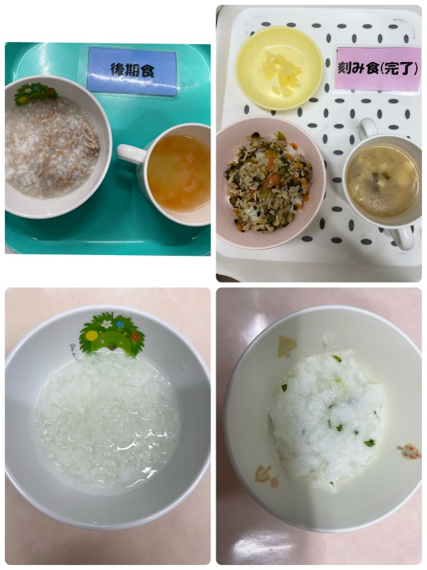 後期 豚そぼろおじや、みそ汁 完了期 豚丼、豆腐みそ汁、パイン缶 15時のおやつ おじや、七草粥