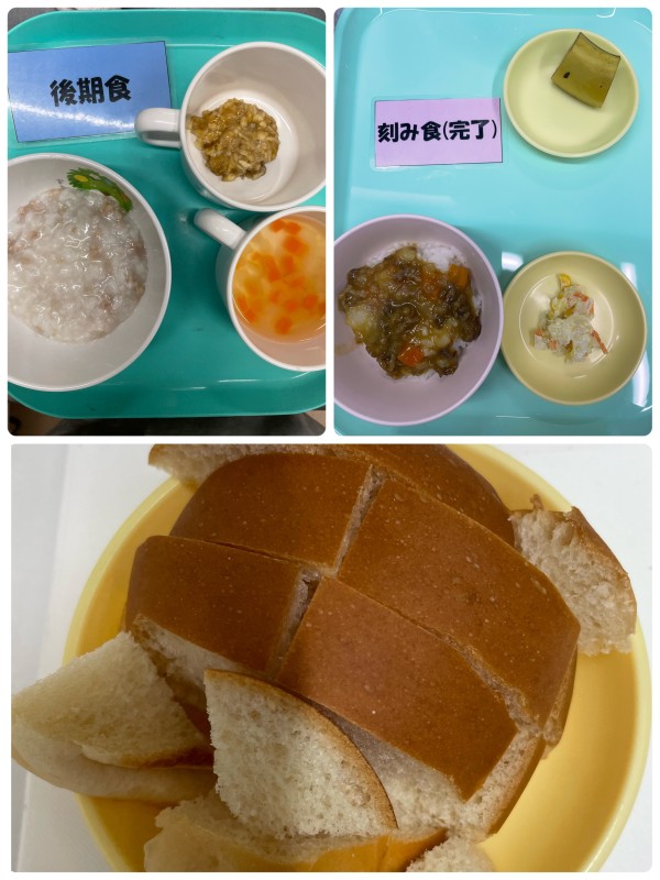 後期 豚そぼろおじや、スープ、バナナ 完了期 カレーライス、コールスローサラダ、バナナ 15時のおやつ パン