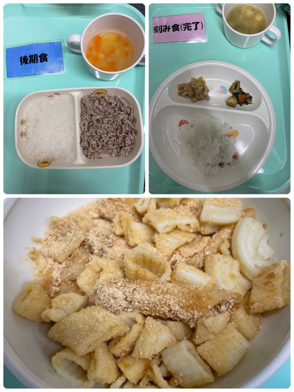 後期 5倍粥、豚のそぼろ煮、みそ汁 完了期 御飯、豚肉と野菜のごま炒め、ひじきとさつま芋の煮物、みそ汁 15時のおやつ ハイハイン、マカロニきなこ