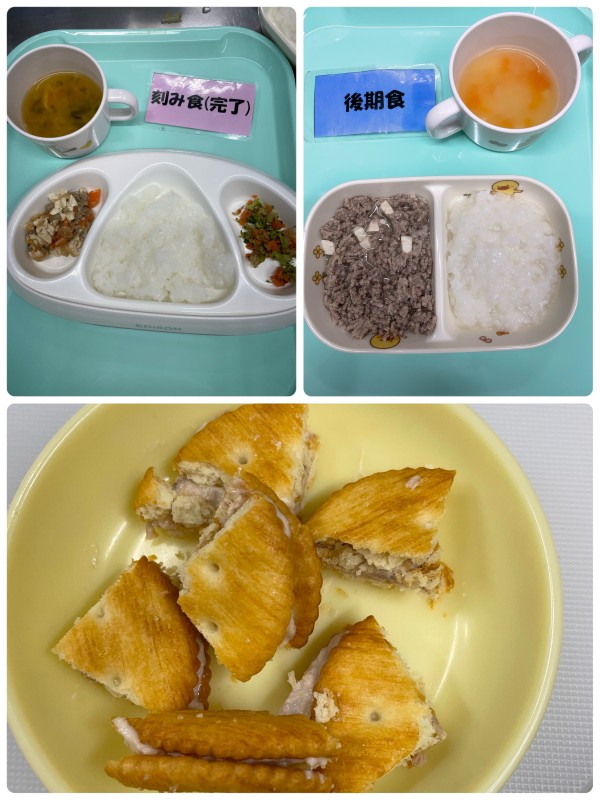 後期 5倍粥、豚のそぼろ煮、みそ汁 完了期 御飯、厚揚げの中華煮、ブロッコリーと人参のおかか和え、みそ汁 15時のおやつ ハイハイン、クラッカーサンド(ツナチーズ)