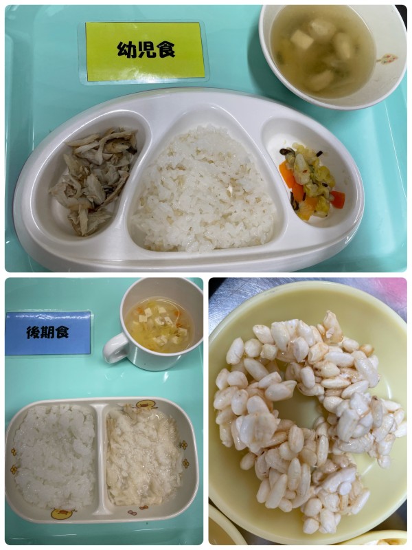 後期 軟飯、白身魚の煮付け、みそ汁 幼児食ご飯、さわらの照り焼き、白菜の昆布和え、みそ汁 15時のおやつ ハイハイン ポン菓子バー