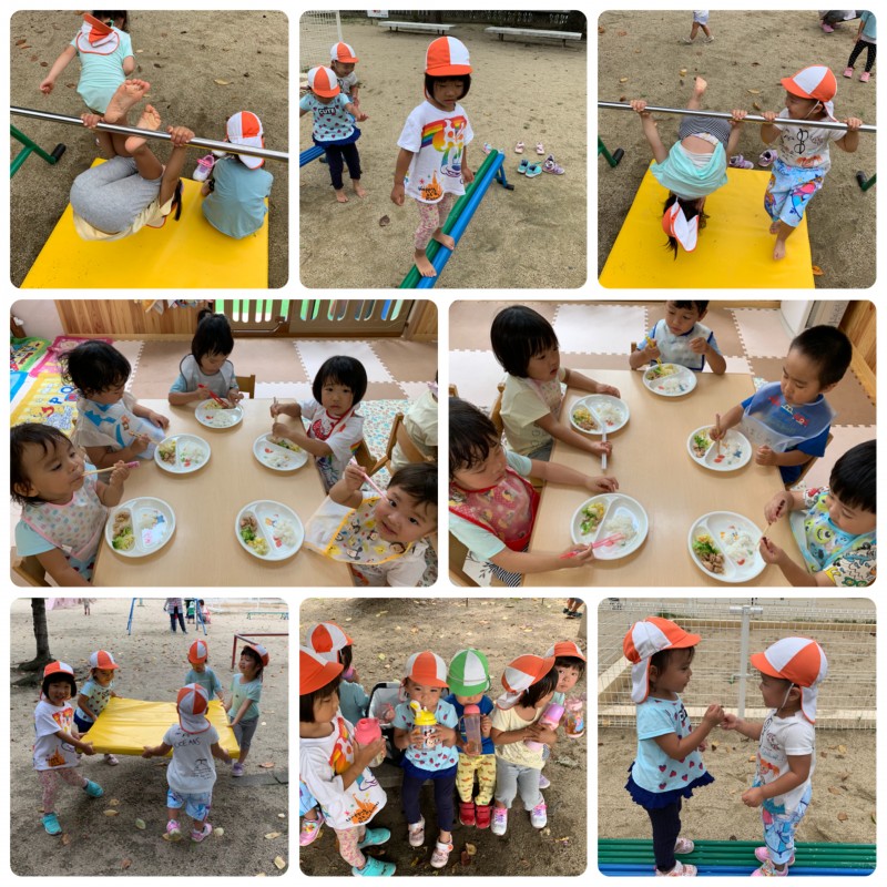 今日は、公園で遊ぼう会の練習も兼ねて遊びました!鉄棒や平均棒を出していたのですが、「これしよ、次こっち〜」等と言いながらお友達と一緒に挑戦し楽しそうに遊んでいました♪毎日、練習することにより日に日に上手になり子どもたちもできるようになったことに喜びを感じ、「もう一回する」と何度も挑戦してくれていて、とても嬉しいです♪また、鉄棒でクルンと回ることができたお友達を見ると「◯◯ちゃん、◯◯くんすごいね〜上手やね」と子どもたち同士で褒め合う姿も多く見られるようになってきました!成長が感じられとても嬉しいです!お片づけの際には、みんなで協力し「よいしょ、よいしょ」と言いながらマットを運んだり、たくさんお手伝いもしてくれていましたよ!そして、給食の際には、お箸で食べる練習をしています!保育者に持ち方を教えてもらいながら頑張ってお箸で食べてくれています。お箸で掴めた時には、「せんせい見て。つかめた」と嬉しそうに見せてくれています!この調子で少しずつ頑張っていけたらと思っています。今日も元気いっぱいのリス組さんでした!