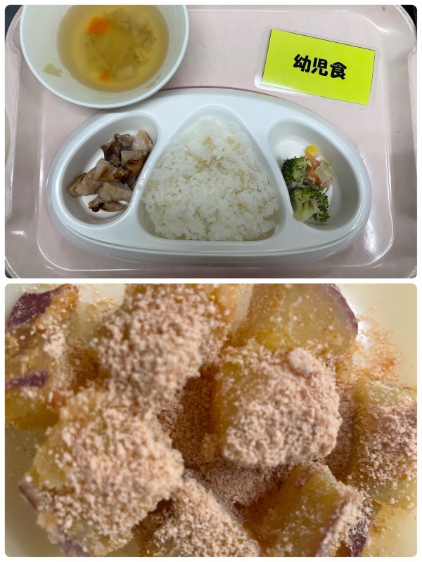 御飯、鶏の照り焼き、ブロッコリーのマヨサラダ、スープ 15時のおやつ きな粉ポテト