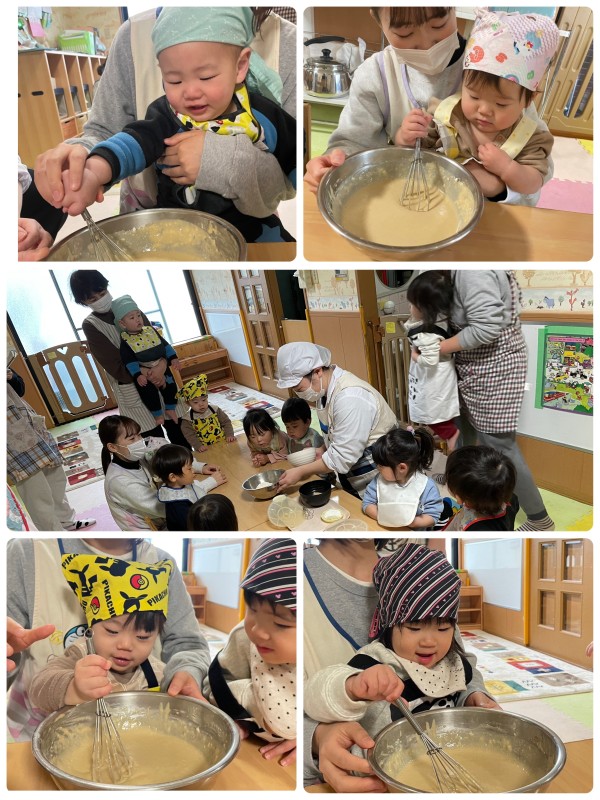 今日はクッキングがありました!みんなの大好きな蒸しパンの材料を混ぜ混ぜ、興味津々で楽しんでいましたよ👀